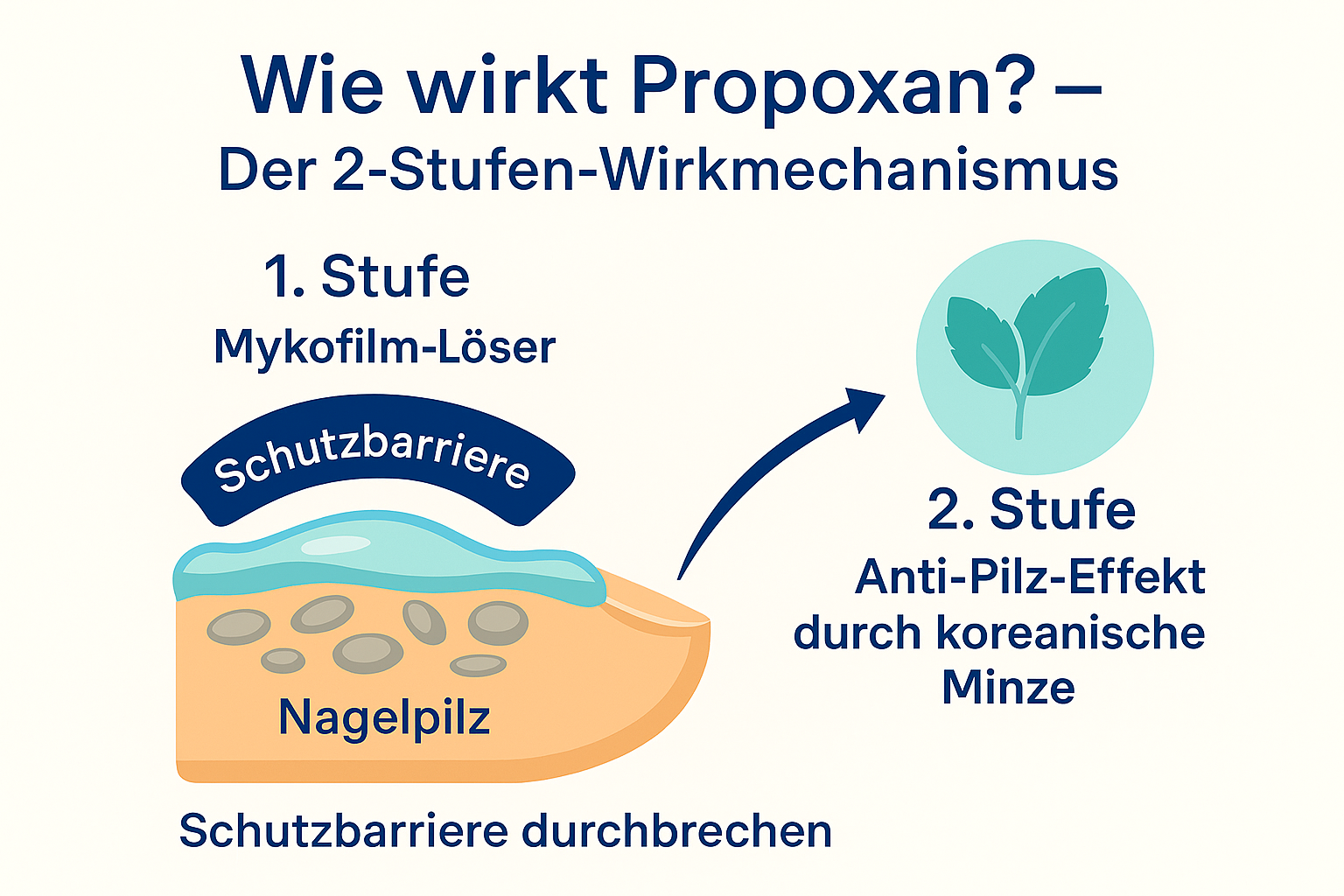 Das Propoxan Ziel: Den Mykofilm des Nagelpilzes auflösen und die volle Anti-Pilz-Wirkung von koreanischem Minzextrakt nutzen um den Pilz nachhaltig anzugreifen.